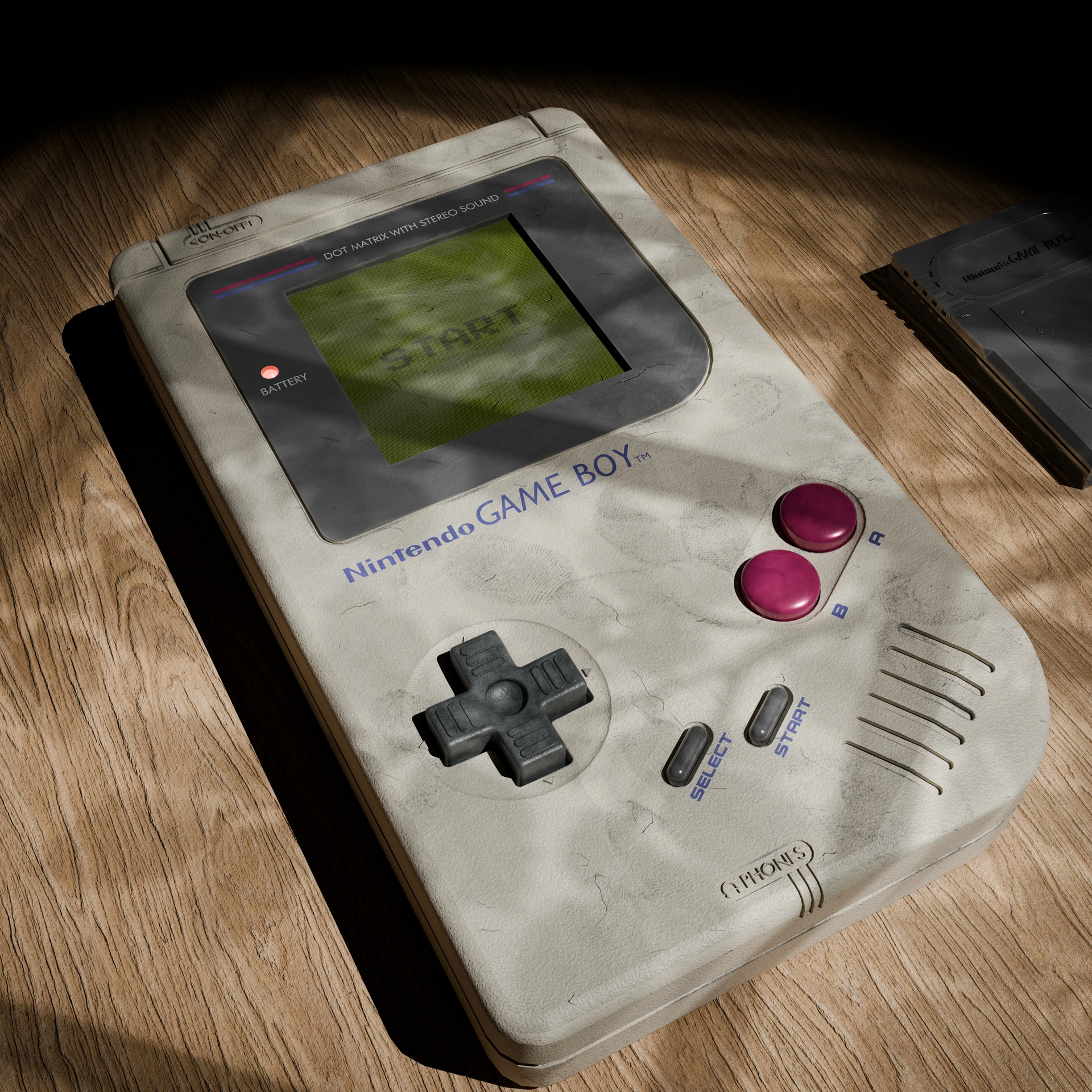 3D model of the original 1989 Nintendo Game Boy, focused on procedural texturing. Emphasis on tactile materials with fingerprint imperfections, dirt edge wear, and procedural scratches to enhance realism. Created as an environmental art piece centered on product visualization.